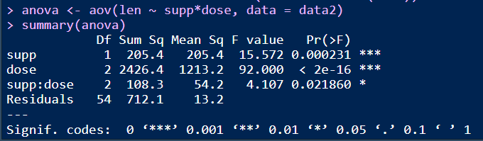 anova <- aov(len ~ supp*dose, data = data2) #two way anova