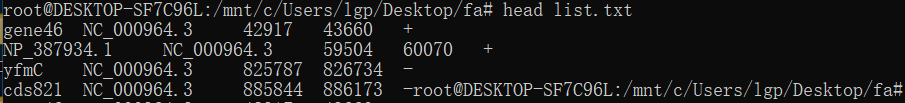 # python3 seq_select.py -i Bacillus_subtilis.str168.fasta -l list.txt -o gene.fasta --detail